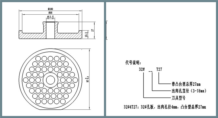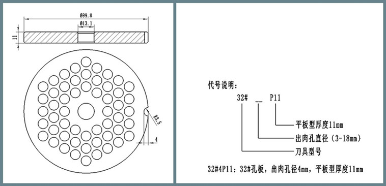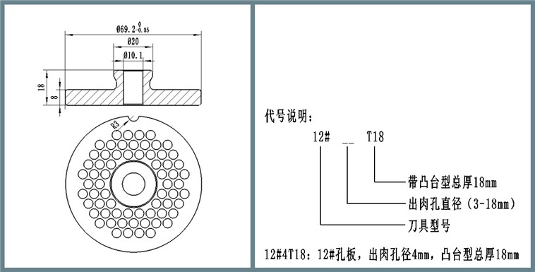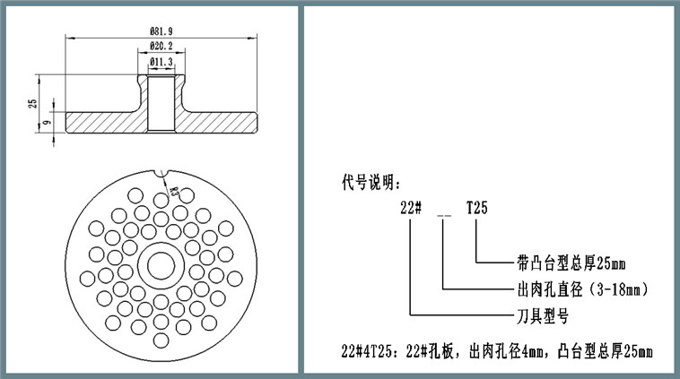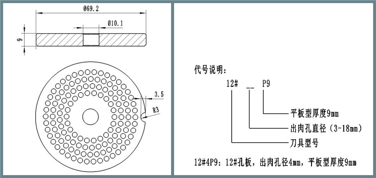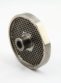 适用于12#、22#、32#绞肉机,可制成直孔、斜孔、异型孔等出肉孔径φ3-φ30mm,材料选用优质的合金工具钢Cr12Mov经锻造后,精密加工而成,成熟的热处理工艺,产品美观,不生锈、不断裂、刀刃锋利、耐磨损、使用寿命长。型号齐全,也可根据客户提供的机型、图纸或实物制作。